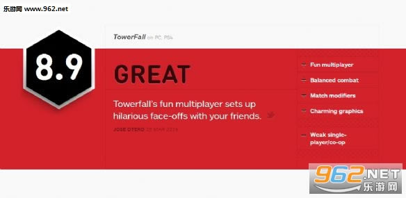 《魔塔大乱斗》(Towerfall Ascension)是一款冒险动作游戏,由索尼已经与众多独立制作组合作,为PS4首发准备了许多精彩的小型游戏,而《魔塔大乱斗》现在也加入了他们的队伍。游戏采用8位元点阵绘图与经典平台关卡的复古风设计,允许4名玩家闯关乱斗,玩家将扮演闯荡迷宫塔的冒险者,运用手中弓箭来对抗敌人。